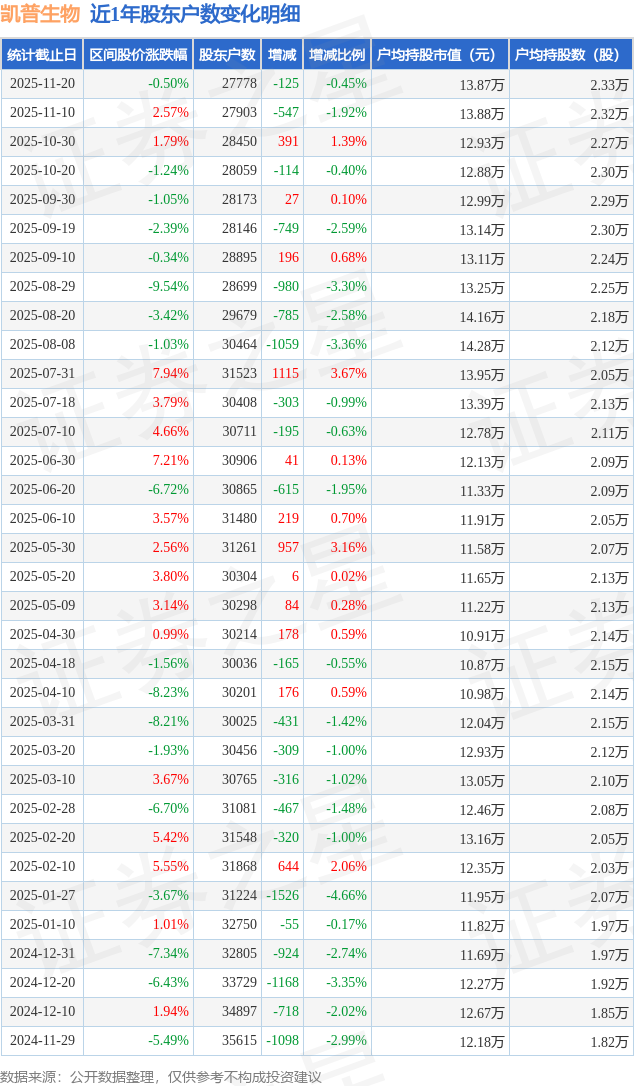 从股价来看,2025年11月10日至2025年11月20日,凯普生物区间跌幅为0.5%,在此期间股东户数减少125.0户,减幅为0.45%。