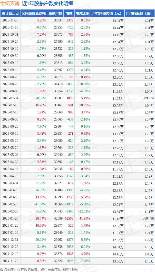 从股价来看,2025年11月10日至2025年11月20日,世纪天鸿区间涨幅为5.26%,在此期间股东户数增加2379.0户,增幅为8.51%。