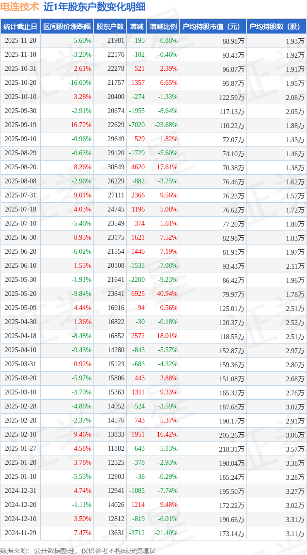 从股价来看,2025年11月10日至2025年11月20日,电连技术区间跌幅为5.6%,在此期间股东户数减少195.0户,减幅为0.88%。