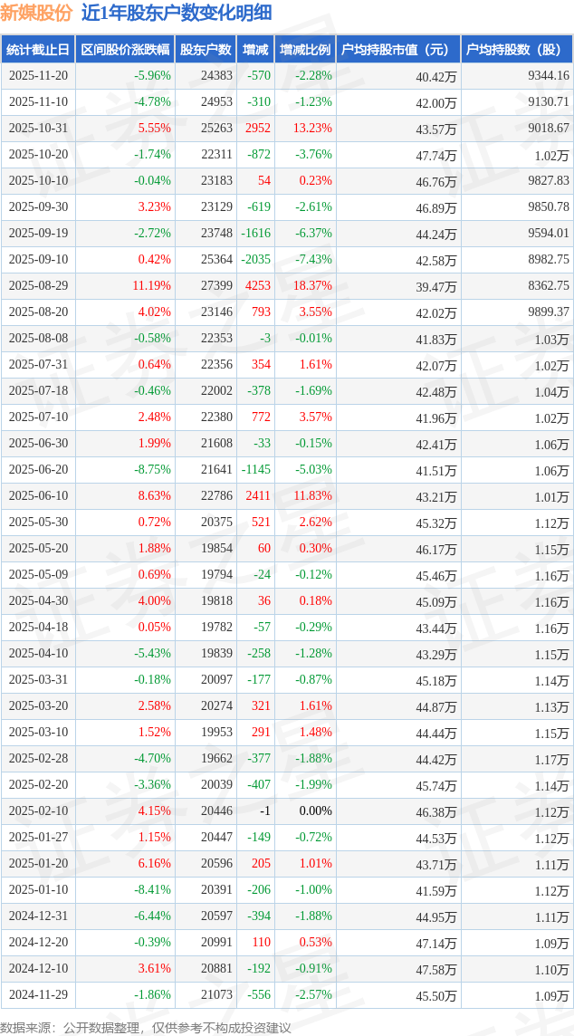 从股价来看,2025年11月10日至2025年11月20日,新媒股份区间跌幅为5.96%,在此期间股东户数减少570.0户,减幅为2.28%。