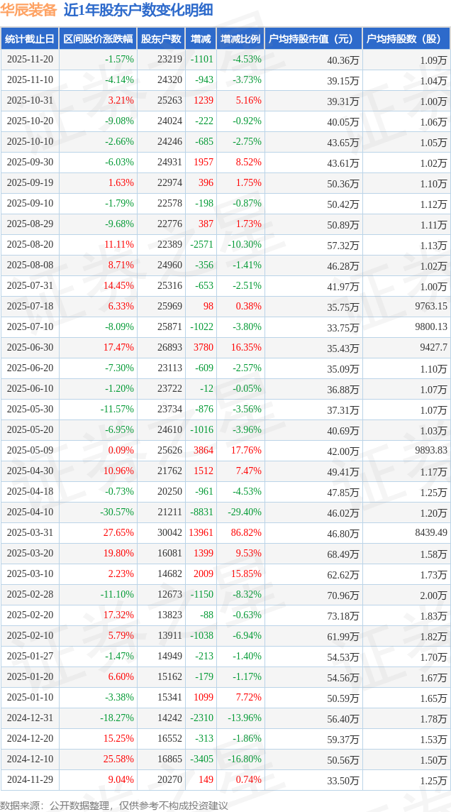 从股价来看,2025年11月10日至2025年11月20日,华辰装备区间跌幅为1.57%,在此期间股东户数减少1101.0户,减幅为4.53%。