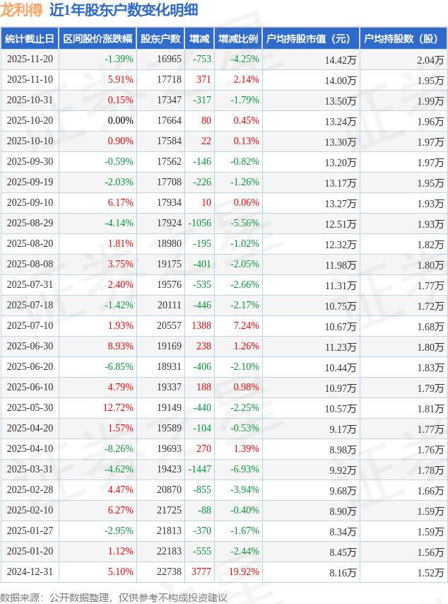 从股价来看,2025年11月10日至2025年11月20日,龙利得区间跌幅为1.39%,在此期间股东户数减少753.0户,减幅为4.25%。