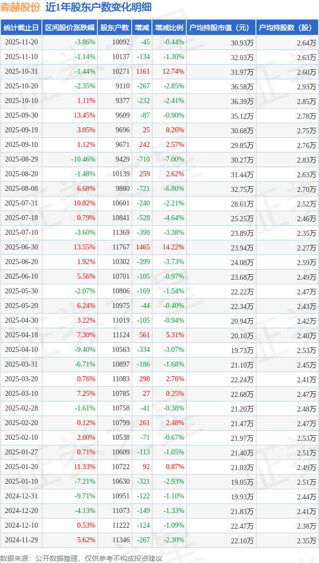 从股价来看,2025年11月10日至2025年11月20日,森赫股份区间跌幅为3.86%,在此期间股东户数减少45.0户,减幅为0.44%。