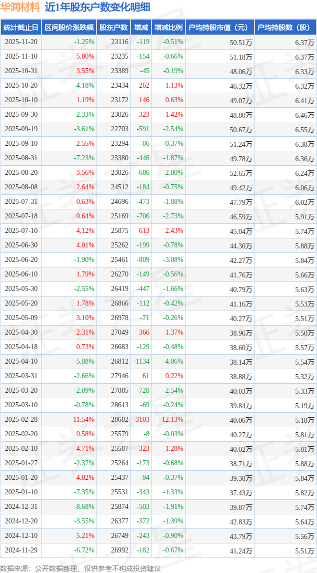 从股价来看,2025年11月10日至2025年11月20日,华润材料区间跌幅为1.25%,在此期间股东户数减少119.0户,减幅为0.51%。