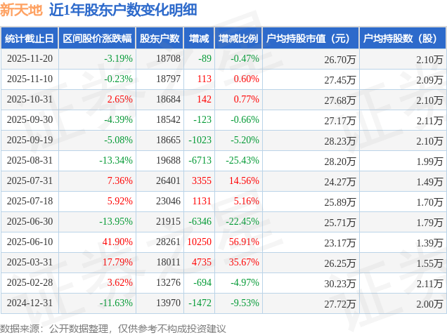 从股价来看,2025年11月10日至2025年11月20日,新天地区间跌幅为3.19%,在此期间股东户数减少89.0户,减幅为0.47%。