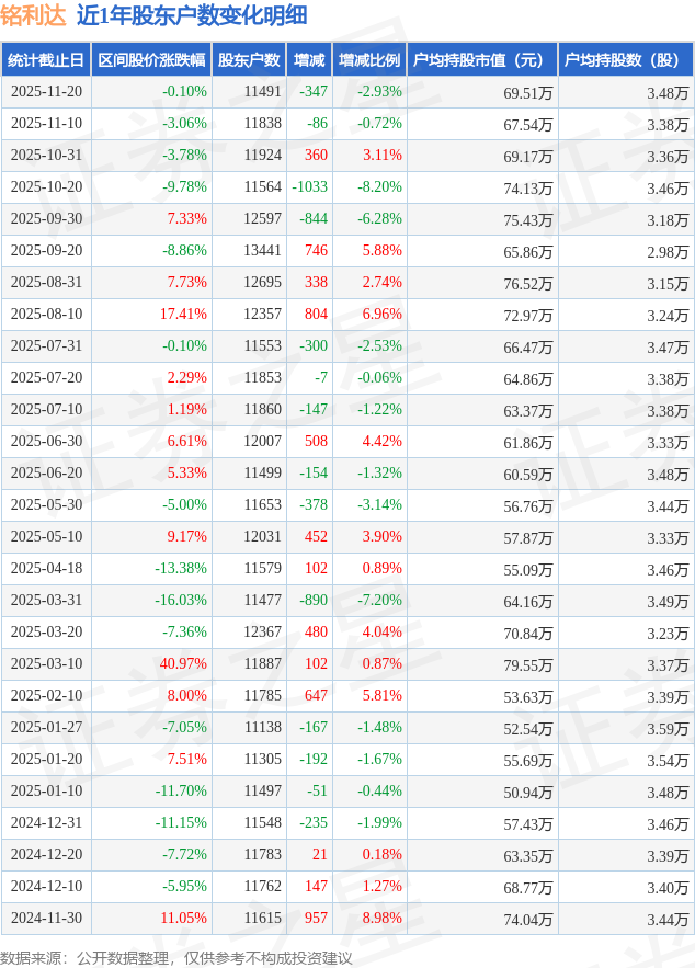 从股价来看,2025年11月10日至2025年11月20日,铭利达区间跌幅为0.1%,在此期间股东户数减少347.0户,减幅为2.93%。