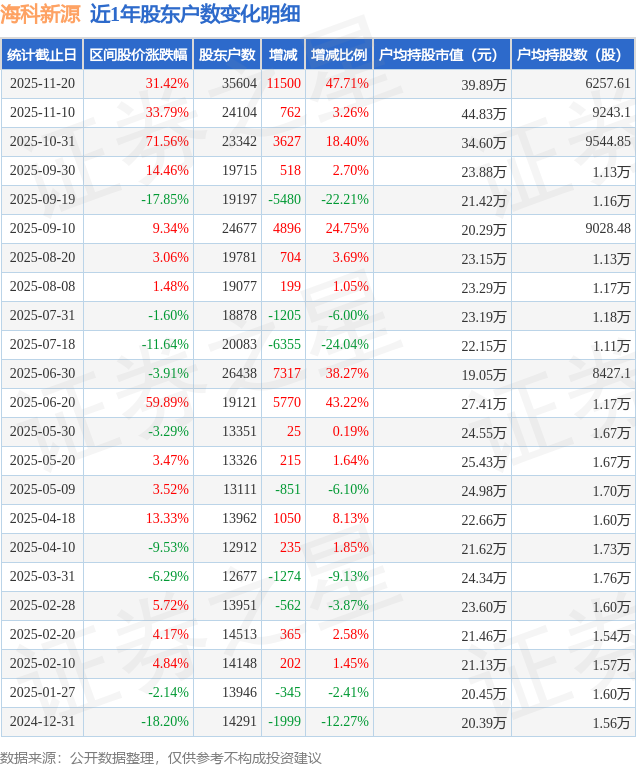 从股价来看,2025年11月10日至2025年11月20日,海科新源区间涨幅为31.42%,在此期间股东户数增加1.15万户,增幅为47.71%。