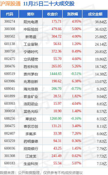 当日北向资金余额额度充足,特发信息(000070)领涨,涨幅10.0%,交易所公布的沪深股通二十大成交股中成交额前三的为阳光电源、中际旭创、新易盛,成交额分别为38.84亿元、36.02亿元、25.88亿元。详情可见下表: