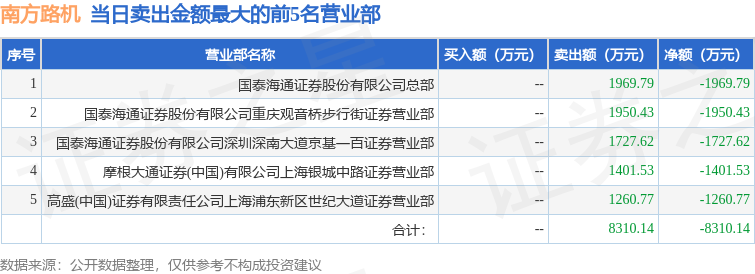 证券之星消息,沪深交易所2025年11月25日公布的交易公开信息显示,南方路机(603280)因有价格涨跌幅限制的日换手率达到20%的前五只证券登上龙虎榜。此次是近5个交易日内第2次上榜。