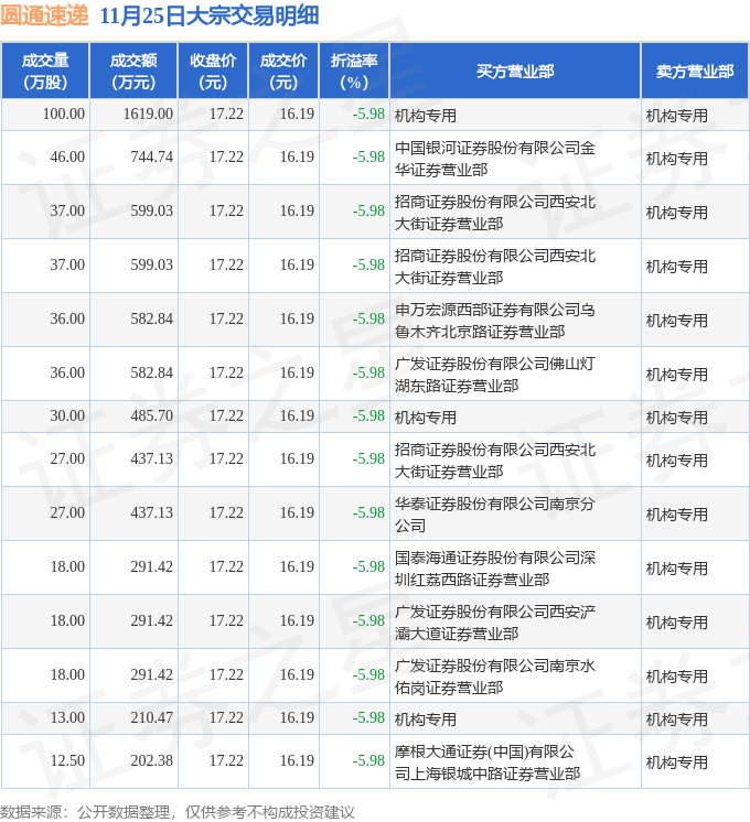 证券之星消息,11月25日圆通速递发生大宗交易,交易数据如下: