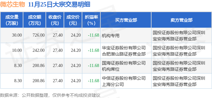 证券之星消息,11月25日微芯生物发生大宗交易,交易数据如下: