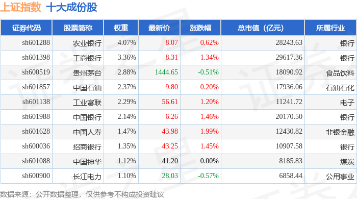 上证指数(000001)十大成份股详情如下: