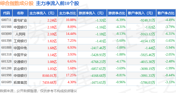 资金流向方面,综合指数(000008)成份股当日主力资金净流出合计9.59亿元,游资资金净流入合计1.56亿元,散户资金净流入合计8.04亿元。成份股资金流向详情见下表: