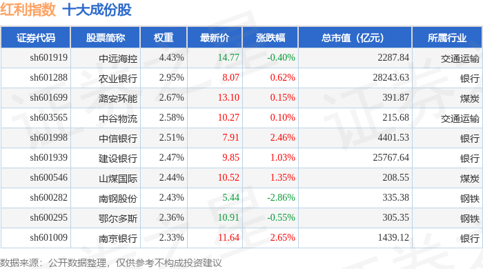 证券之星消息,11月25日,红利指数(000015)报收于3093.55点,涨0.47%,成交263.14亿元,换手率0.26%。当日该指数成份股中,上涨的有31家,南京银行以2.65%的涨幅领涨,下跌的有14家,南钢股份以2.86%的跌幅领跌。