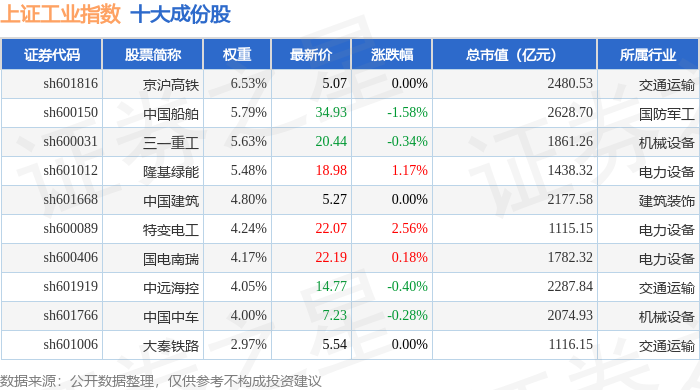 证券之星消息,11月25日,上证工业(000034)指数报收于2202.05点,跌0.19%,成交385.26亿元,换手率0.6%。当日该指数成份股中,上涨的有17家,圆通速递以2.56%的涨幅领涨,下跌的有26家,中国东航以3.89%的跌幅领跌。