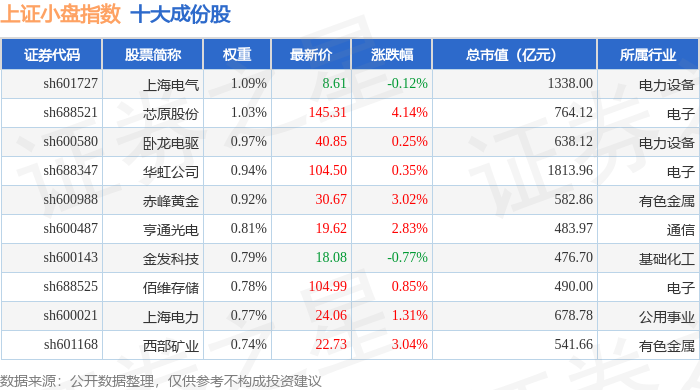 上证小盘(000045)指数十大成份股详情如下: