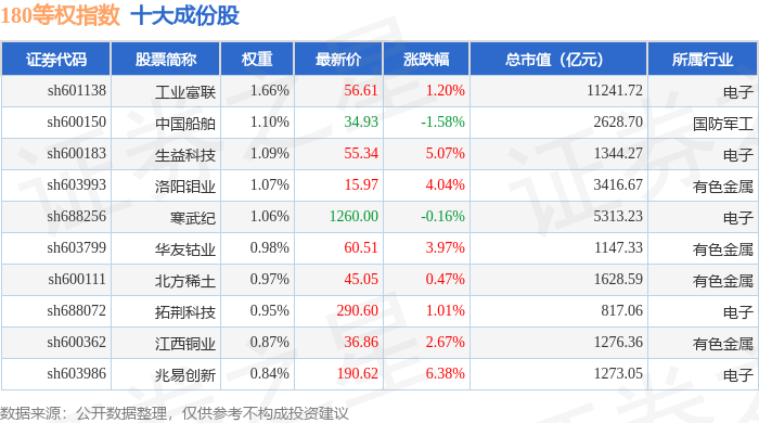 证券之星消息,11月25日,180等权(000051)指数报收于9101.58点,涨0.65%,成交2115.65亿元,换手率0.41%。当日该指数成份股中,上涨的有116家,兆易创新以6.38%的涨幅领涨,下跌的有53家,中国国航以3.01%的跌幅领跌。