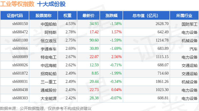 证券之星消息,11月25日,工业等权(000072)指数报收于2954.17点,跌0.27%,成交385.26亿元,换手率0.6%。当日该指数成份股中,上涨的有17家,圆通速递以2.56%的涨幅领涨,下跌的有26家,中国东航以3.89%的跌幅领跌。