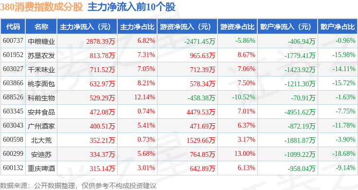 资金流向方面,380消费(000108)指数成份股当日主力资金净流入合计1914.41万元,游资资金净流入合计1.13亿元,散户资金净流出合计1.32亿元。成份股资金流向详情见下表: