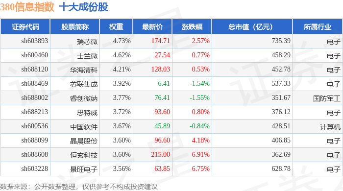 证券之星消息,11月25日,380信息(000111)指数报收于9081.14点,涨1.1%,成交226.48亿元,换手率1.65%。当日该指数成份股中,上涨的有32家,恒玄科技以6.91%的涨幅领涨,下跌的有12家,中望软件以1.58%的跌幅领跌。