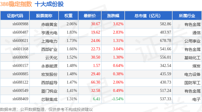 380稳定(000142)指数十大成份股详情如下:
