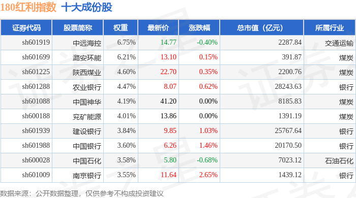 证券之星消息,11月25日,180红利(000149)指数报收于4105.72点,涨0.84%,成交334.98亿元,换手率0.24%。当日该指数成份股中,上涨的有23家,南京银行以2.65%的涨幅领涨,下跌的有3家,中国石化以0.68%的跌幅领跌。
