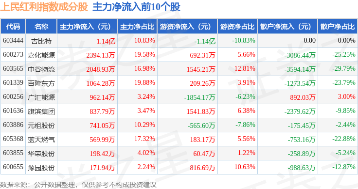 资金流向方面,上民红利(000153)指数成份股当日主力资金净流入合计6625.5万元,游资资金净流入合计599.02万元,散户资金净流出合计7224.52万元。成份股资金流向详情见下表: