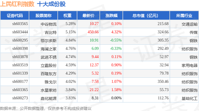 上民红利(000153)指数十大成份股详情如下: