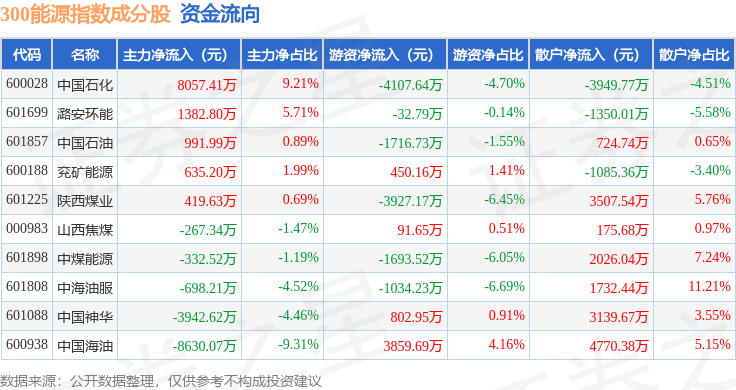 资金流向方面,300能源(000908)指数成份股当日主力资金净流出合计2383.73万元,游资资金净流出合计7307.62万元,散户资金净流入合计9691.35万元。成份股资金流向详情见下表: