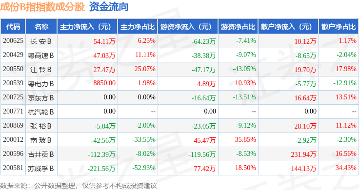 资金流向方面,成份B指(399003)指数成份股当日主力资金净流出合计252.05万元,游资资金净流出合计181.26万元,散户资金净流入合计433.3万元。成份股资金流向详情见下表: