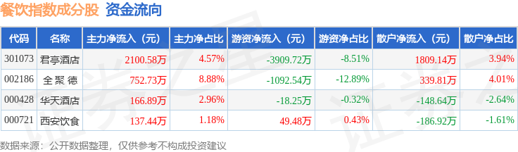资金流向方面,餐饮指数(399238)成份股当日主力资金净流入合计3157.64万元,游资资金净流出合计4971.03万元,散户资金净流入合计1813.39万元。成份股资金流向详情见下表: