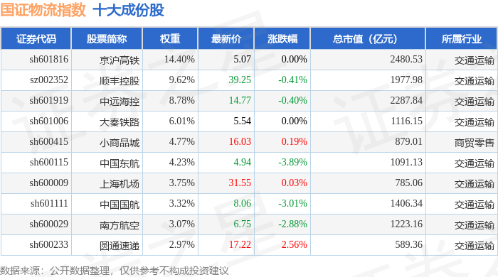 证券之星消息,11月25日,国证物流(399353)指数报收于2090.06点,跌0.44%,成交128.86亿元,换手率0.53%。当日该指数成份股中,上涨的有16家,圆通速递以2.56%的涨幅领涨,下跌的有21家,中国东航以3.89%的跌幅领跌。