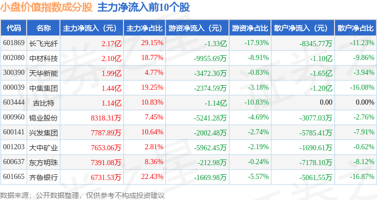 资金流向方面,小盘价值(399377)指数成份股当日主力资金净流入合计15.84亿元,游资资金净流出合计2.95亿元,散户资金净流出合计12.98亿元。成份股资金流向详情见下表: