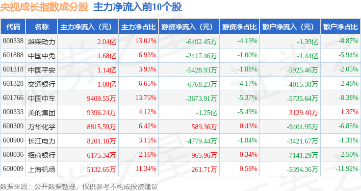 资金流向方面,央视成长(399552)指数成份股当日主力资金净流入合计6.36亿元,游资资金净流入合计1.08亿元,散户资金净流出合计7.44亿元。成份股资金流向详情见下表: