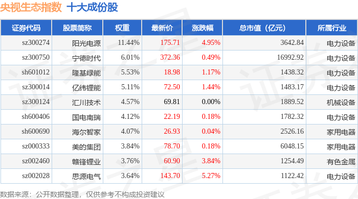 央视生态(399556)指数十大成份股详情如下: