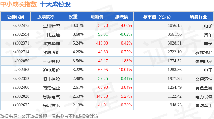 证券之星消息,11月25日,中小成长(399602)指数报收于1213.13点,涨1.81%,成交1027.58亿元,换手率2.58%。当日该指数成份股中,上涨的有74家,沪电股份以10.01%的涨幅领涨,下跌的有23家,海大集团以3.41%的跌幅领跌。