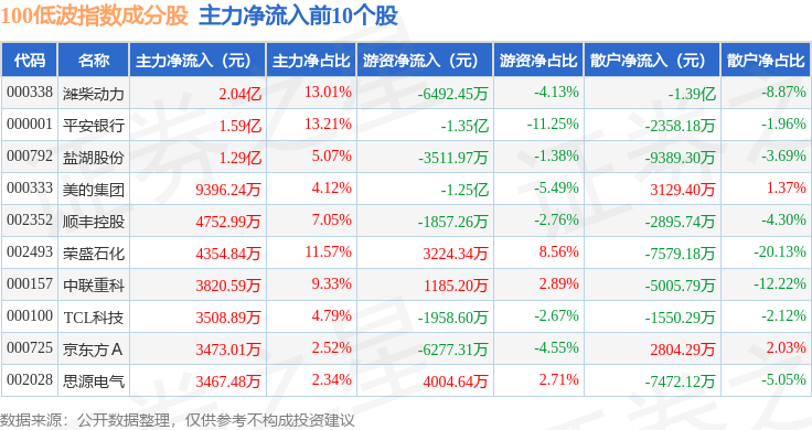 资金流向方面,100低波(399645)指数成份股当日主力资金净流入合计2861.37万元,游资资金净流出合计6486.93万元,散户资金净流入合计3625.56万元。成份股资金流向详情见下表: