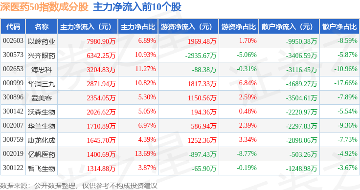 资金流向方面,深医药50(399647)指数成份股当日主力资金净流入合计9640.06万元,游资资金净流入合计1.87亿元,散户资金净流出合计2.84亿元。成份股资金流向详情见下表: