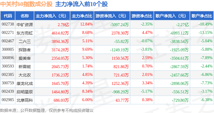 资金流向方面,中关村60(399697)指数成份股当日主力资金净流出合计20.42亿元,游资资金净流入合计5.79亿元,散户资金净流入合计14.63亿元。成份股资金流向详情见下表: