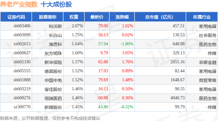 养老产业(399812)指数十大成份股详情如下: