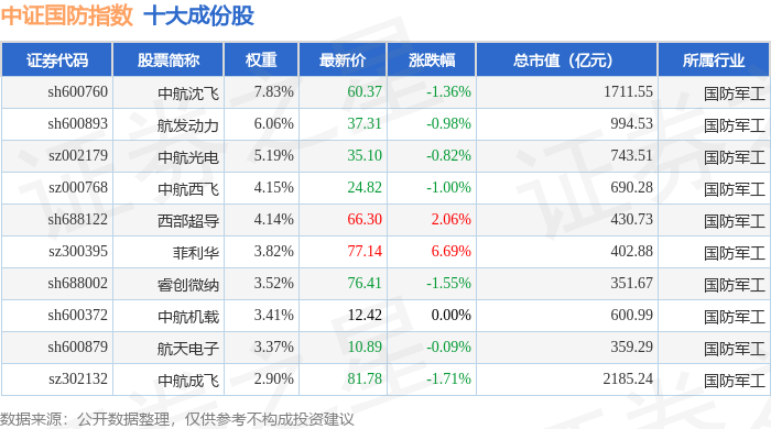 证券之星消息,11月25日,中证国防(399973)指数报收于1611.94点,跌0.46%,成交274.3亿元,换手率1.91%。当日该指数成份股中,上涨的有12家,菲利华以6.69%的涨幅领涨,下跌的有37家,国科军工以4.64%的跌幅领跌。
