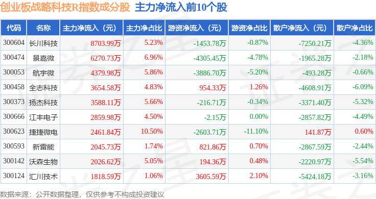 资金流向方面,创业板战略科技R(471004)指数成份股当日主力资金净流出合计6.24亿元,游资资金净流入合计4255.94万元,散户资金净流入合计5.82亿元。成份股资金流向详情见下表: