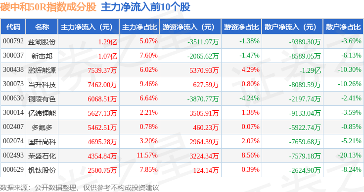 资金流向方面,碳中和50R(480021)指数成份股当日主力资金净流入合计2.84亿元,游资资金净流入合计6.29亿元,散户资金净流出合计9.14亿元。成份股资金流向详情见下表: