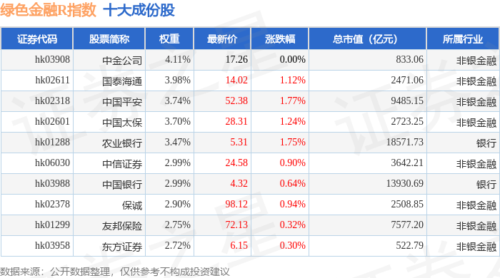 绿色金融R(480052)指数十大成份股详情如下: