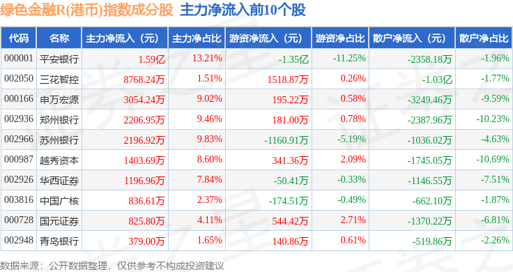 资金流向方面,绿色金融R(港币)(480053)指数成份股当日主力资金净流出合计1.94亿元,游资资金净流入合计789.72万元,散户资金净流入合计1.86亿元。成份股资金流向详情见下表: