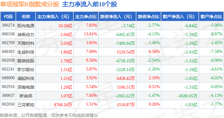 资金流向方面,单项冠军R(480150)指数成份股当日主力资金净流入合计22.51亿元,游资资金净流入合计5164.88万元,散户资金净流出合计23.03亿元。成份股资金流向详情见下表: