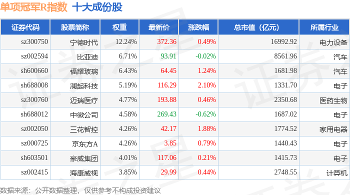 单项冠军R(480150)指数十大成份股详情如下: