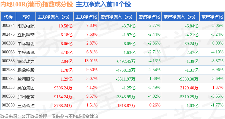 资金流向方面,内地100R(港币)(483002)指数成份股当日主力资金净流入合计24.98亿元,游资资金净流出合计13.69亿元,散户资金净流出合计11.29亿元。成份股资金流向详情见下表: