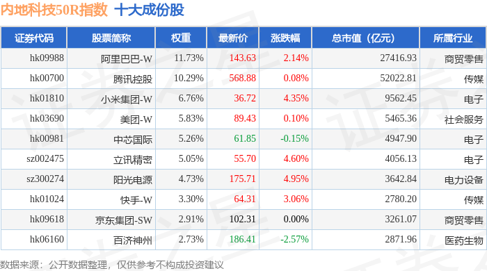 证券之星消息,11月25日,内地科技50R(483003)指数报收于3311.16点,涨1.09%,成交1125.03亿元,换手率1.05%。当日该指数成份股中,上涨的有39家,阳光电源以4.95%的涨幅领涨,下跌的有10家,百济神州以2.57%的跌幅领跌。