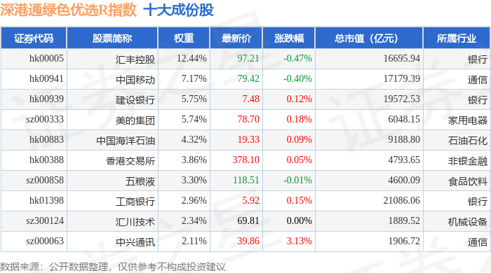 深港通绿色优选R(483011)指数十大成份股详情如下: